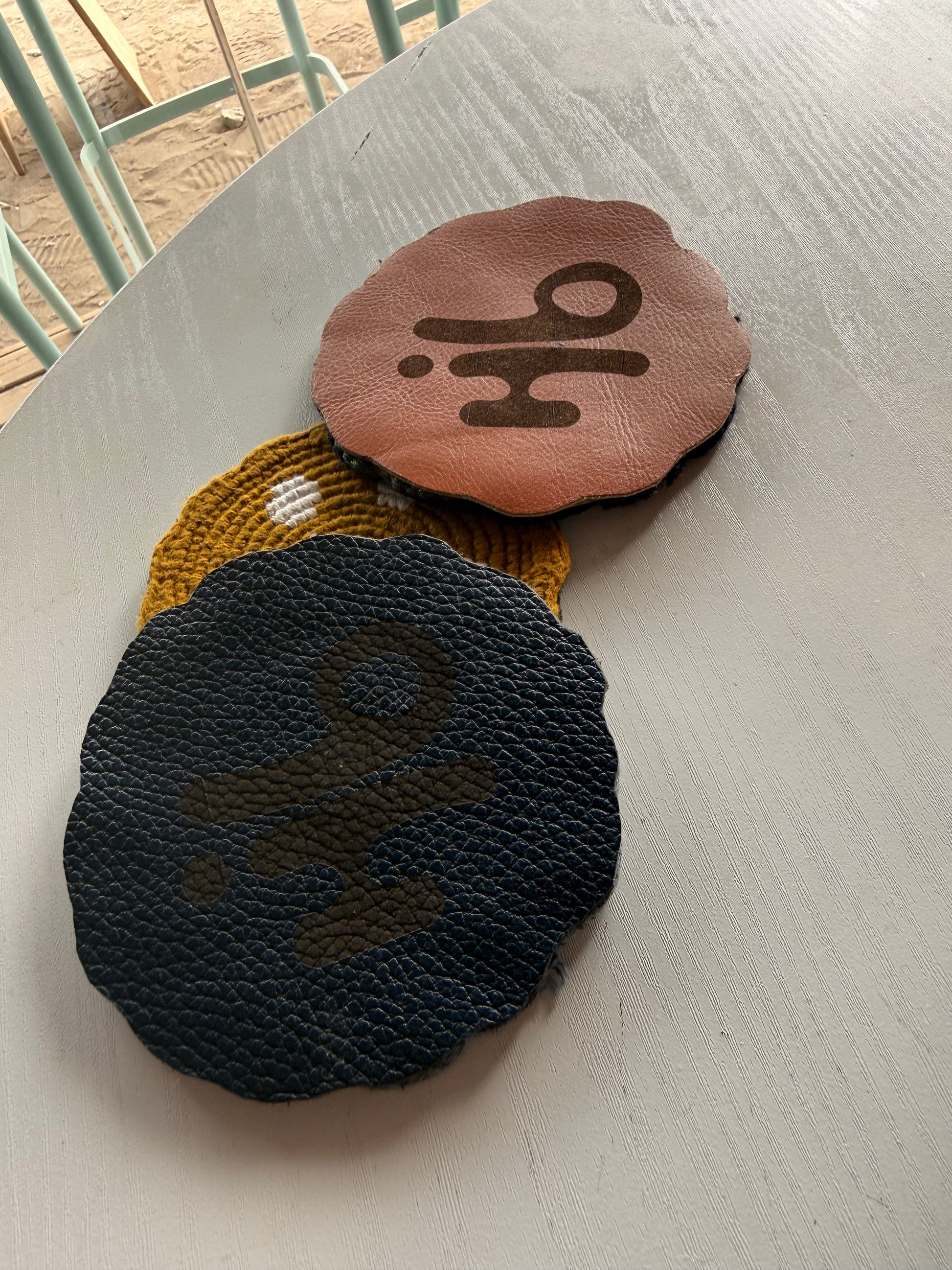 Porta vasos de cuero con grabado láser y tejido realizado en Corporativa Atitlan. *Precio unitario